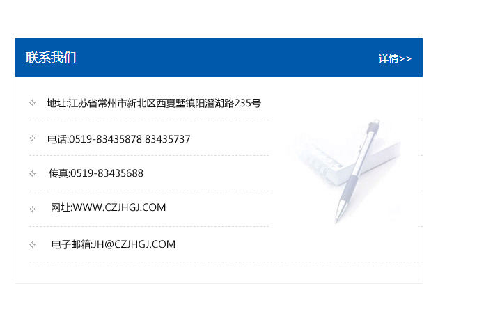 地址:常州市新北區友邦商務大廈1幢16、17層  電話:0519-85101652  傳真:0519-85112595  郵編:213022  網址:www_cz-jiayue_cn.cfqccc.com  郵箱:xiajifengaa@163.com